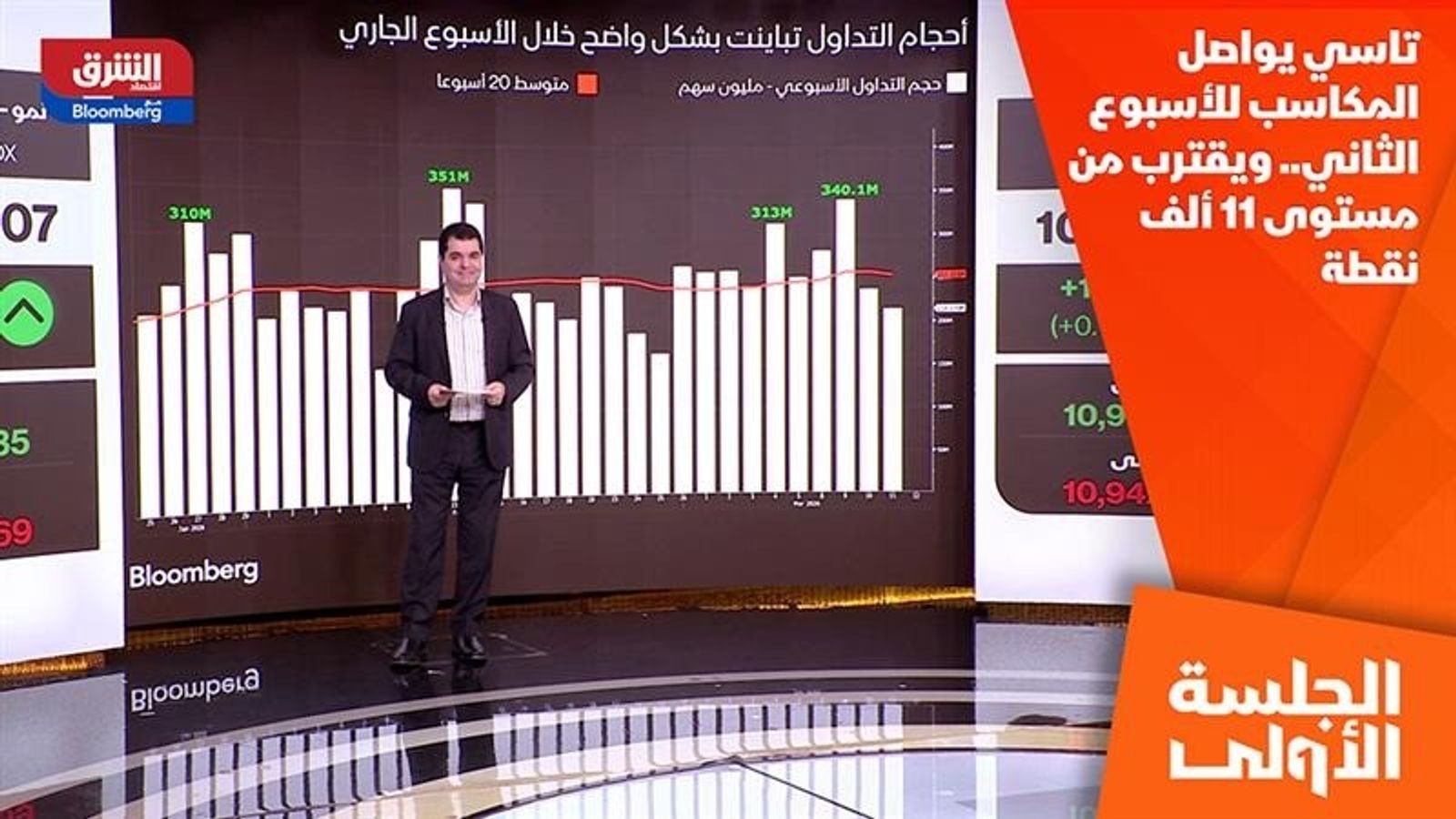 حقق مؤشر تاسي مكاسب للأسبوع الثاني على التوالي بنحو 1.5%، مقتربا من مستوى أحد عشر ألف نقطة بحسب هشام العياص، كبير المحللين الماليين في الشرق، الذي أوضح أن المؤشر يواجه تحديا فنيا عند متوسط الـ50 يوما، مع تداولات ضمن نطاق ضيق وتراجع نسبي في أحجام التداول بعد نشاط قوي مطلع الأسبوع، ما يترك السوق بانتظار محفزات جديدة.