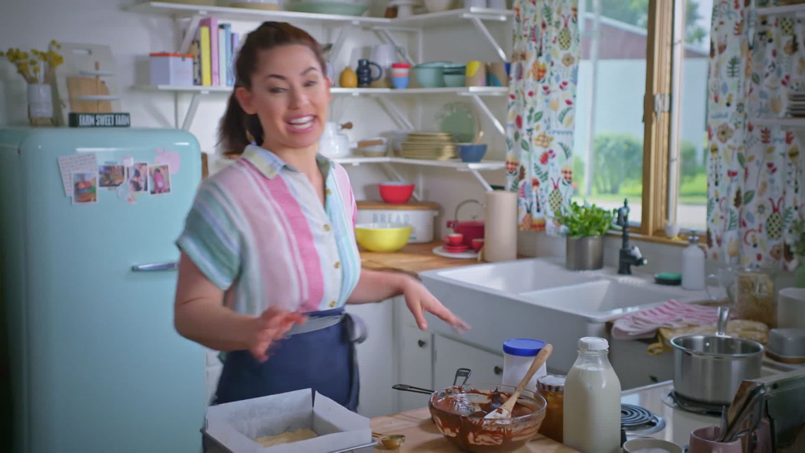 في أجواء ريفية مبهجة، تُعدّ الشيف مولي يي أمسية سينمائية مميزة على المزرعة، تبدأ بتقديم طبق ناتشوز غني ومشبع بطبقات من لحم الخنزير المسحوب المطهو ببطء بصلصة الباربكيو الشهية، ليمنح الضيوف تجربة دافئة ومليئة بالنكهات، ثم تُكمل الأمسية بتقديم سلطات فردية منعشة مستوحاة من حلاوة ألواح الشوكولاتة والحلوى