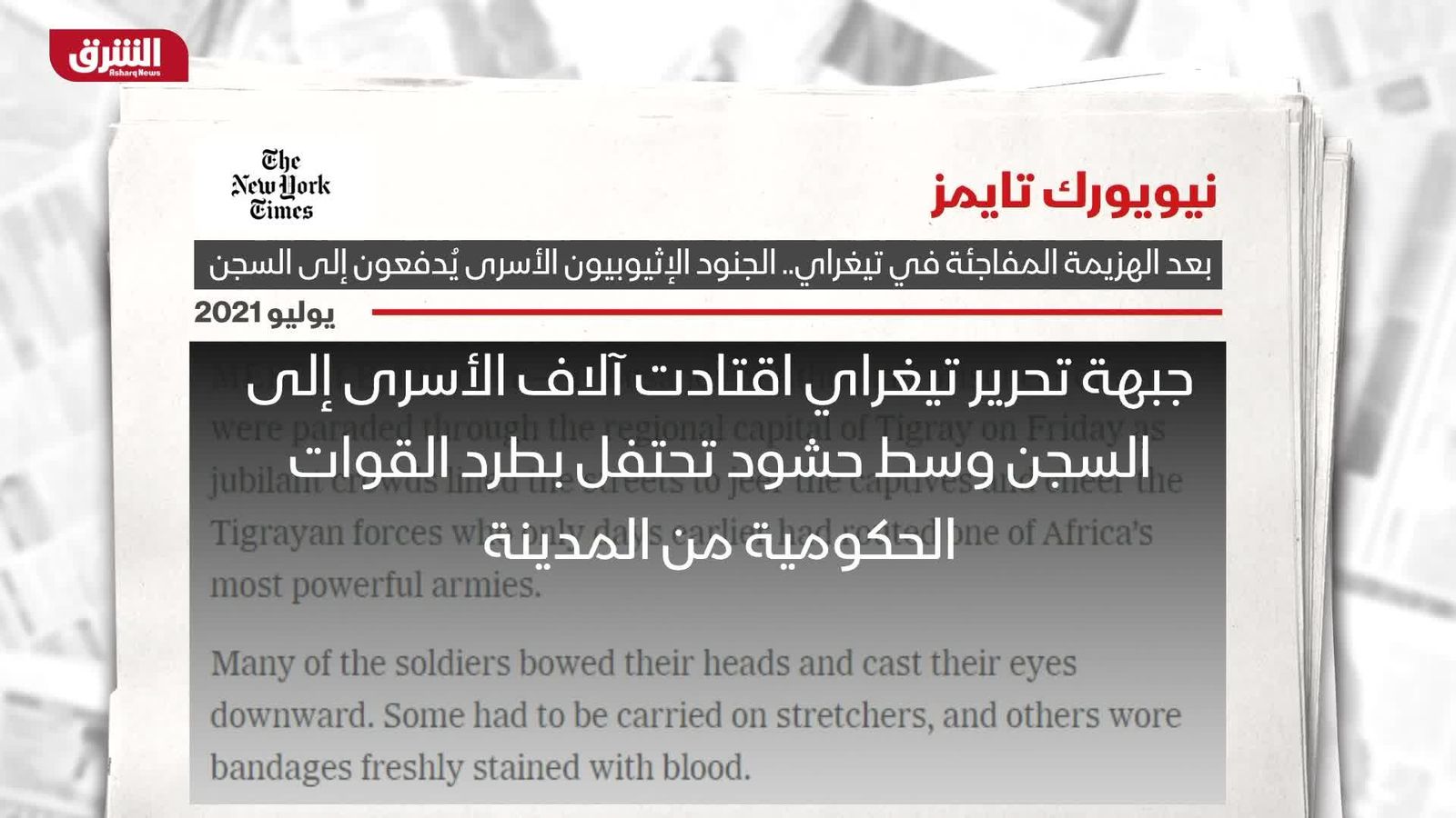شهدت عاصمة إقليم تيغراي عرضاً لآلاف الجنود الإثيوبيين الأسرى وهم يمشون وسط حشود تحتفل بطرد القوات الحكومية من المدينة.. وفقاً لقوات تيغراي فقد سار أكثر من 7 آلاف جندي ما يقارب 75 كيلومتراً قبل إيداعهم سجناً كبيراً على الحافة الشمالية للمدينة.