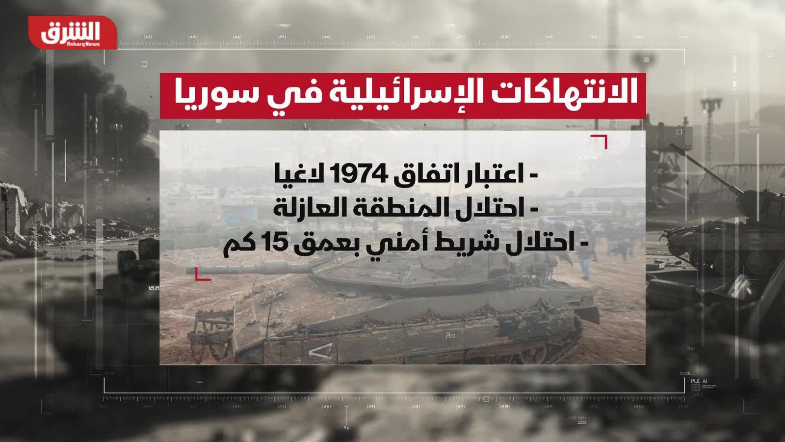 استغلت إسرائيل الفراغ الأمني والسياسي بعد سقوط نظام بشار الأسد في 8 ديسمبر 2024 لتنفيذ انتهاكات واسعة في سوريا. ألغت اتفاقية فض الاشتباك 1974، واحتلت المنطقة العازلة وشريطاً أمنياً بعمق 15 كم. وبحلول مارس 2025، أصبحت إسرائيل تحتل 600 كم²، وأنشأت 9 قواعد أبرزها في جبل الشيخ، ودمرت نحو 80% من القدرات العسكرية السورية.